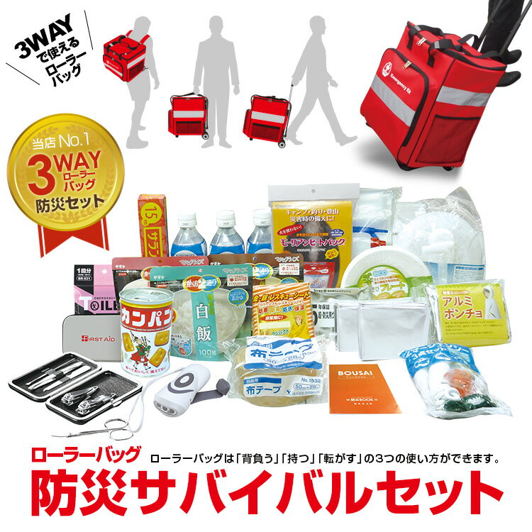 背負う&持つ&転がすことができる3WAYのローラーバッグ型防災バッグを採用。道路ではキャリーで、階段ではリュックでちょっとした距離は手持ちなど、場面に合わせて使い分けができる便利な防災バッグです。 セット内容も厳選されたものばかり。 ※セット商品は状況により画像のものと異なる同等品となる場合がございます。 ●iPhone6/5・スマホ充電可能。お持ちのスマホの充電ケーブルで本機とスマホを接続して充電してください。 【セット内容】 バッグ、ダイナモラジオ、軍手、ホイッスル、ロープ3m、アルミポンチョ、非常用ブランケット、給水タンク3L、保存水500ml×3本、マジックライス×3食、カンパン、救急セット(収納ポーチ・絆創膏・包帯・コットンパフ・綿棒・救急手引)、グルーミングセット、スチームシェフ3回分、紙皿、サランラップ15m、布テープ、非常用スリーピングバッグ、携帯用ミニトイレ、レスキューシート、防災用ウェットティッシュ、コンパクトエアーベッド、防災チェックリスト メーカー希望小売価格はメーカーカタログに基づいて掲載しています。 関連キーワード レスキュー商品仕様 品番 BR-903N 商品名 ローラーバッグ防災サバイバルセット セット内容 バッグ、ダイナモラジオ、軍手、ホイッスル、ロープ3m、アルミポンチョ、非常用ブランケット、給水タンク3L、保存水500ml×3本、マジックライス×3食、カンパン、救急セット(収納ポーチ・絆創膏・包帯・コットンパフ・綿棒・救急手引)、グルーミングセット、スチームシェフ3回分、紙皿、サランラップ15m、布テープ、非常用スリーピングバッグ、携帯用ミニトイレ、レスキューシート、防災用ウェットティッシュ、コンパクトエアーベッド、防災チェックリスト JAN 4571286597202 特記事項 ※セット商品は状況によって画像のものと異なる同等品となる場合がございます。バッグもデザインが変更となる場合がございます。予めご了承ください。