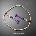 主玉直径:約7.7mm(腹部分) 親玉直径:約13.8mm(腹部分) 長さ:約39cm(ピンと張った場合の親玉から親玉まで) 重さ:約51g 備考:桐箱入り 真言宗用の正式なお数珠(本連数珠)です。 この数珠は星月菩提樹という風流な名称でよばれています木の実が主玉で、白っぽいですが使い込んでいくうちに飴色になってゆきます。 木の実ですが実用性の高い素材として数珠に良く用いられています。 尺2サイズは男性のご利用が多いサイズですが、女性のご利用も結構あります。 長めの数珠ですので数珠入れは一般の略式数珠用では収まりません。 経本数珠入れなど、容量の大きい数珠入れをご用意ください。 黒い背景は写真用電球照明、白い背景は写真用LED照明での撮影です。 利休房は従来の毛の出ている菊房に比べて強度が勝ります。 最近はこのタイプの房が主流になってきています。 2つの親玉それぞれから2本ずつの房が出ているのが真言宗用数珠の特徴です。 よく、数珠の玉は108個・・・と言われますが、それは主玉(おもだま。一番数多く入っている玉)のことで、 それ以外に四天王玉や親玉、弟子玉などがありますのでトータルでは108個よりもずっと数多くなります。 【この数珠を修理する場合のページのご案内】↓ 中糸(環の部分に通してある糸) が切れた場合はこちら (数珠修理) 中糸通しのみ尺2までサイズ 房部分を破損した場合はこちら (親玉から先、弟子玉が通してある部分など) (数珠修理) 真言宗本連利休房 尺2