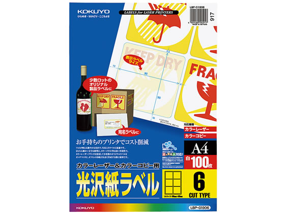 【お取り寄せ】コクヨ カラーLBP&コピー用光沢紙ラベルA4 6面 100枚 LBP-G1906 レーザー用ラベルシール 粘着ラベル用紙
