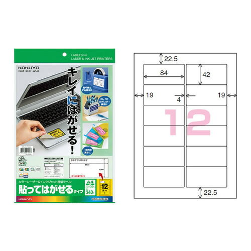 KOKUYO/カラーレーザー&インクジェット用 紙ラベル ○再はくりのりを使っているため、一度貼ってもきれいにはがせます。期間限定の表示など、一時的な表示に最適です。 ○プリンタを選ばないマルチ対応ラベルです。 ※用紙厚さ144g/m2以上に対応する機種でお使いください。 ※用紙種類が選択できる機種で「ラベル紙」または「厚紙」に設定し、印刷してください。 ※MOなどのメディア類やPP製のファイルなど表面が凸凹している場合は、浮き・はがれが発生する場合があります。 サイズ A4 面数 12面 1片の大きさ 42×84mm 枚数 20枚 紙厚 ラベル本体=0.10mm(総厚144g/m2・0.16mm) 白色度 94%程度(ISO)A4サイズ(KPC-HH101-20) 面数:ノーカット 1片の大きさ:297×210mm 枚数:20枚 A4サイズ(KPC-HH110-20) 面数:10面 1片の大きさ:50.8×86.4mm 枚数:20枚 A4サイズ(KPC-HH112-20) 面数:12面 1片の大きさ:42×84mm 枚数:20枚 A4サイズ(KPC-HH124-20) 面数:24面 1片の大きさ:35×66mm 枚数:20枚