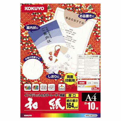 商品名 コクヨ / カラーレーザー&インクジェット用紙(和紙・厚口)A4【KPC-W1310】 メーカー国 日本 メーカー名 コクヨ / KOKUYO 仕様 ■用紙寸法:タテ 297mm × ヨコ 210mm ■サイズ:A4 ■仕様:厚口 ■紙厚:0.27mm(164g/m2) ■枚数:10枚 ■両面印刷用紙 備考 ●レーザー・インクジェットの両方に対応した高級感あふれる和紙のプリンタ用紙です。 ●高級感のある和風便せんや冠婚葬祭の案内状・メニューやPOP、ショップカードなどを作るのに最適です。輸入・デザイン文具 ↓↓↓同シリーズの各サイズはこちらのリンクからどうぞ↓↓↓ 【薄口・片面印刷用】 【薄口・片面印刷用】【KPC-W1110】はこちら!! 【厚口・両面印刷用】 【厚口・両面印刷用】【KPC-W1310】はこちら!!