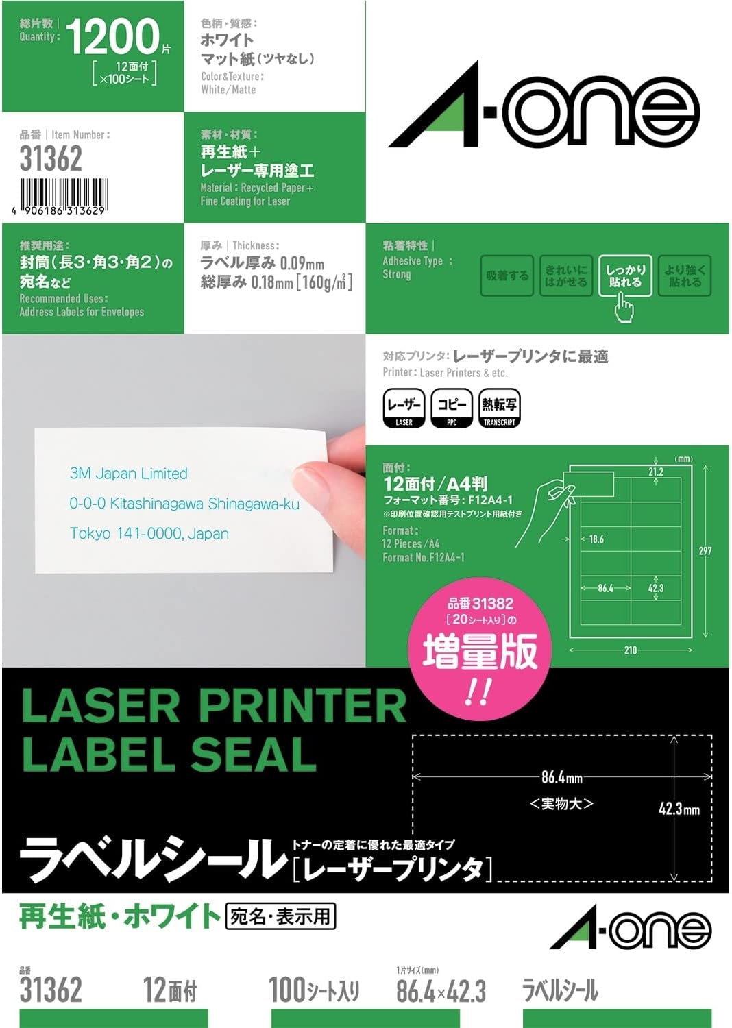 北海道・沖縄・離島へのお届けは別途送料がかかります。詳しくはこちら特徴:上紙も裏紙も100%古紙を使用。手間のかかる宛名や表示ラベルが手軽にキレイに作れます。特殊加工で抜群のトナー定着を実現。商品仕様:◆厚み:155g/平方メートル(0.18mm)◆入数:100シート(1200片)◆12面四辺余白付(2列×6段)◆材質:再生紙ゆうパケット可/1個まで】スリーエム エーワン ラベルシール レーザー 再生紙 12面 100枚 31362ゆうパケット制限数量以上の購入はこちら
