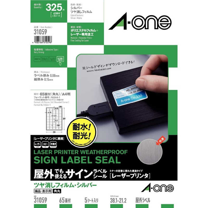 【商品解説】●レーザープリンタでの印字適性に優れたラベルシールです。●備品管理や資産管理用表示ラベルにぴったりです。●素材は水にも強く、アルミ銘板のようなツヤ消しシルバーフィルムです。【スペック】●型式:31059(31059)●JANコード:4906186310598サイズ:A4枚数:5シート面付き:65面紙質:マット耐水:耐水対応プリンタ:レーザープリンタ、コピー機、手書き仕様1:【一片サイズ】38.1mm×21.2mm仕様2:【紙質】ポリエステルフィルム仕様3:【タイプ・特性】より強く貼れる、屋外でも使えるタイプ、シルバーツヤ消しフィルムこの商品は宅配便でお届けする商品です出荷可能日から最短日時でお届けします。※出荷完了次第メールをお送りします。配送サービス提供エリアを調べることができます「エリア検索」をクリックして、表示された画面にお届け先の郵便番号7桁を入力してください。ご購入可能エリア検索お買い上げ合計3,980円以上で送料無料となります。※3,980円未満の場合は、一律550円(税込)となります。●出荷可能日から最短日時でお届けします。(日時指定は出来ません。) ※お届け時に不在だった場合は、「ご不在連絡票」が投函されます。 「ご不在連絡票」に記載された宅配業者の連絡先へ、再配達のご依頼をお願いいたします。●お届けは玄関先までとなります。●宅配便でお届けする商品をご購入の場合、不用品リサイクル回収はお受けしておりません。●全て揃い次第の出荷となりますので、2種類以上、または2個以上でのご注文の場合、出荷が遅れる場合があります。詳細はこちら■商品のお届けについて商品の到着日については、出荷完了メール内のリンク(宅配業者お荷物お問い合わせサービス)にてご確認ください。詳しいお届け目安を確認する1度の注文で複数の配送先にお届けすることは出来ません。※注文時に「複数の送付先に送る」で2箇所以上への配送先を設定した場合、すべてキャンセルとさせていただきます。