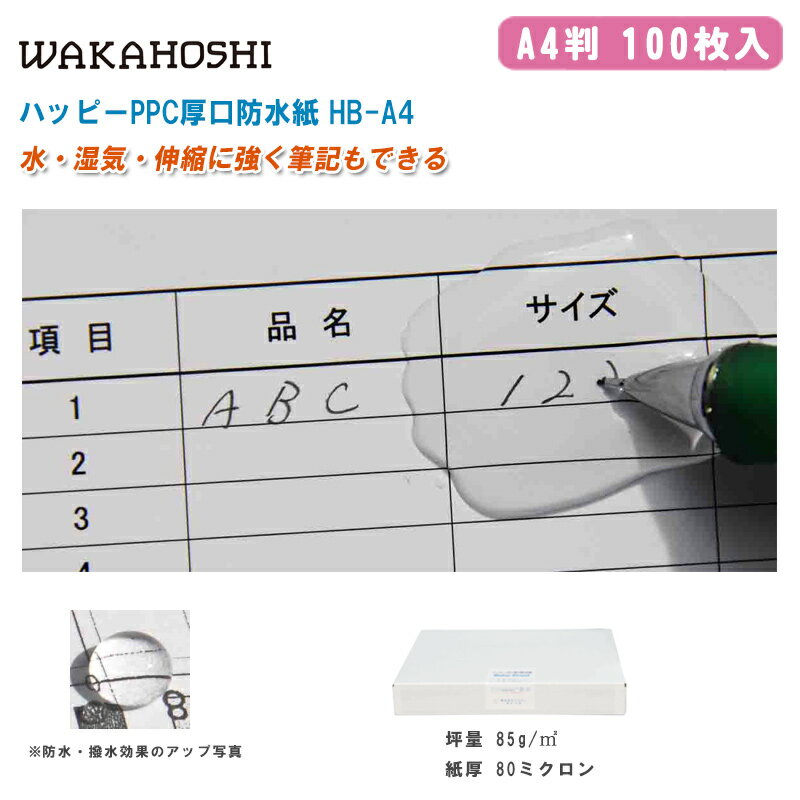 ワカホシ ハッピーPPC 厚口防水紙 A4 100枚入 HB-A4【A4判 両面防水紙 撥水加工紙 屋外作業竣工図面 屋外ポスター レーザープリンター用紙 製図用品】