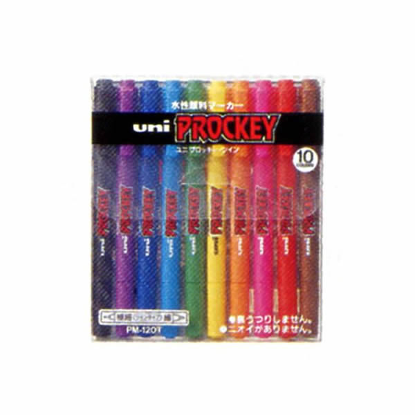 三菱鉛筆 PROCKEY プロッキー 10色セット PM-120T 10C <極細+細字丸芯> ■種類 サインペン ■描線 極細(0.4mm)+細字丸芯(0.9mm) ■サイズ(単品) 軸径φ13.0×厚さ17.0×全長145.6mm ■重量(単品) 10.0g●紙に書いても、にじみが少なく、裏うつりしない水性顔料インク。 ●郵便物にも安心して使える耐水性。 ●インク色:黒、紫、青、水色、緑、黄、橙、桃、赤、茶