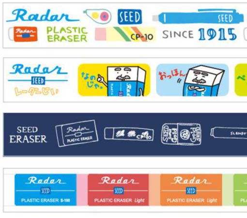 ●サイズ:15mm×10m●セット内容: カラーイラスト柄(KMT-SD1),レーダー爺柄(KMT-SD2), ブルーイラスト柄(KMT-SD3), カラフルレーダー柄(KMT-SD4)の4巻セット ●文具メーカーのマスキングテープ! 各社のロングランヒット商品をイメージしたマスキングテープです。在庫限りSALE!!★シード消しゴム!マスキングテープ★4巻セット☆カモ井加工紙製造X紀寺商事(Kitera)☆