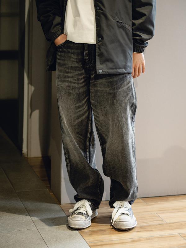 メンズ ジーンズ デニムパンツ 14オンス セルビッジ 赤耳 ヴィンテージ風 ウォッシュ加工 スラブデニム ゆったり ワイド ストレート 無地 シンプル アメカジ カジュアル ジーパン ボトムス ロングパンツ オールシーズン
