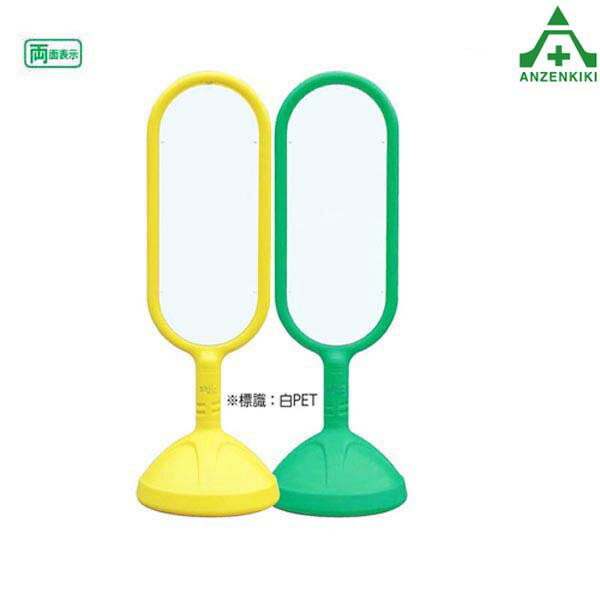 サインキュート (両面白無地)■本体サイズ:直径340×1017mmH■本体カラー:イエロー・グリーン■本体材質:高密度ポリエチレン■本体重量:2kg (満水時:約10kg)■表示サイズ:606×230×1mm厚■表示材質:透明PET樹脂 (穴左2右2) 裏印刷白PET樹脂 (穴左2右2) 表印刷(プラスチックビス8付)