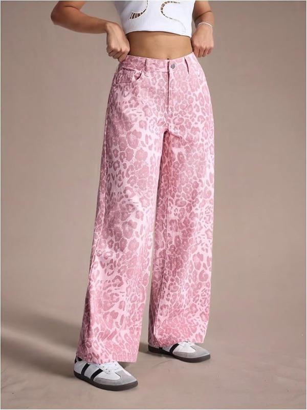 ジーンズ レディース ヒョウ柄 デニムパンツ ワイドパンツ ストレートパンツ ハイウエスト ピンク系 ゆったり ジーパン 普段使い 春夏