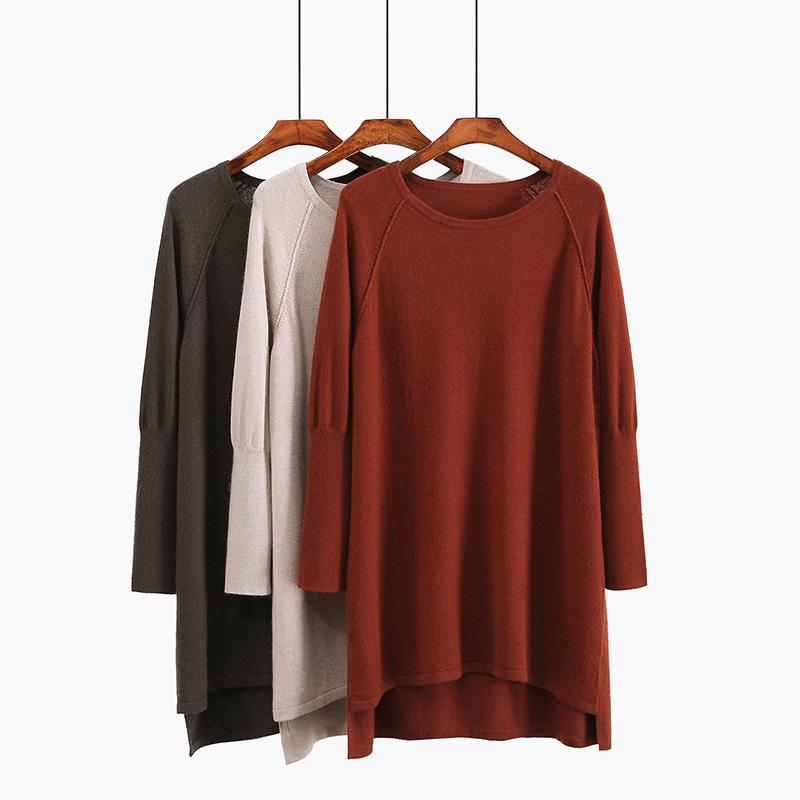 ニット レディース 100%ウール 羊毛 プルオーバー セーター クルーネック 丸首 ミドル丈 ゆったり オーバーサイズ 大きいサイズ 長袖 秋冬 韓国風 通勤 オフィス エレガント トップス