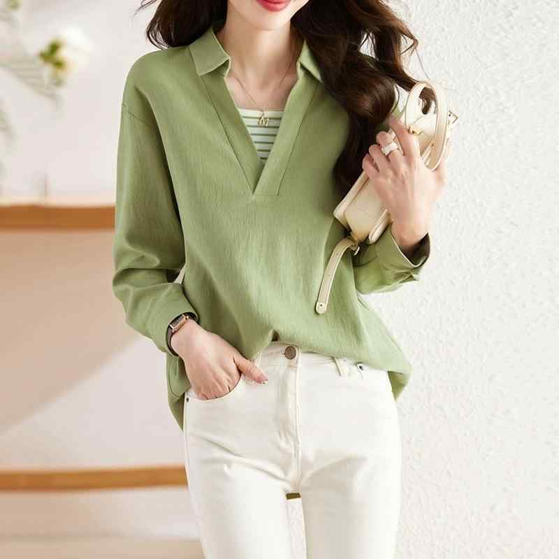 ["・カテゴリ: シャツ","・主な素材: ポリエステル 70%-80%未満","・柄: 無地","・スタイル: プルオーバー、通勤、エレガント","・袖丈: 長袖","・加工: 切り替え","・シルエット: ストレート","・着丈: ミドル丈","・ネックライン: ハーフオープンカラー","・カラー: グリーン","・サイズ: S, M, L, XL, XXL"]