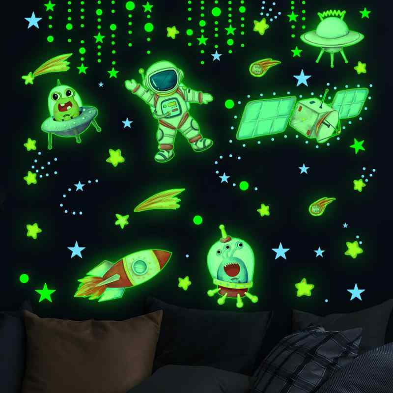 ウォールステッカー 蓄光 夜光 光る かわいい 宇宙飛行士 ロケット 宇宙船 グリーン PVC製 寝室 リビング 子供部屋 書斎 玄関 剥がせる 貼るだけ 4枚組 デコレーション 壁シール