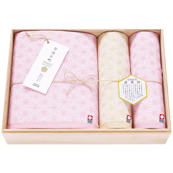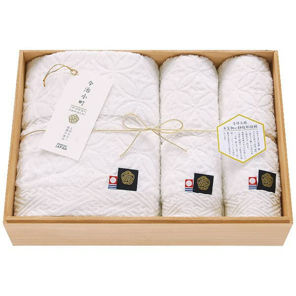 ●紙袋のご用意はできません。●ギフト商品のため納品書は同梱されません。●ご注文者様宛以外へ発送の場合、お届け先様の転居・住所不明・長期不在などが発生した際は商品をご依頼主様へ転送させていただきます。平安時代の女流歌人、小野小町が美しかったことから美しい女性の呼び名として使われる小町。今治で評判の美しい娘をイメージし、伝統の織技術を駆使して一つ一つ織り上げていく。そんなシリーズが今治小町です。 日本古来伝統の麻葉模様を今治でも数少ない先染め2紋体のガーゼ織機でやわらかに織り上げた、まごころ謹呈のギフトです。ガーゼ織機でやわらかに織り上げた、まごころ謹呈のギフトです。麻葉は平安時代から仏像装飾にも使われ、麻の葉の成長の早さから、子供の健やかな成長の願いが込めらています。 ■60×120cmバスタオル1枚・34×75cmフェイスタオル1枚・34×35cmウォッシュタオル3枚・綿100%・(日本製) ■箱サイズ:41×31×12cm【用途】引出物 結婚内祝 婚家 結婚祝 出産内祝 出産祝 仏事 快気 新築 記念 贈答 お返し お祝い 御祝 香典返し 法事 法要 引越し 新築祝い お中元 お歳暮 敬老の日 還暦 賀寿 母の日 父の日 自分へのご褒美 自分へのお取り寄せグルメなど 快気祝い 成人お祝い 金婚式 銀婚式 入籍記念日 白寿 卒寿 米寿 傘寿 喜寿 古希 還暦祝い 賀寿 長寿祝い 緑寿 入園祝い 入学祝い 卒業祝い 就職祝い 新築祝い 開店祝い お土産 お誕生日プレゼント お年賀 お中元ギフト 残暑見舞い●紙袋のご用意はできません。 ●ギフト商品のため納品書は同梱されません。 ●ご注文者様宛以外へ発送の場合 お届け先様の転居・住所不明・長期不在などが発生した際は 商品をご依頼主様へ転送させていただきます。