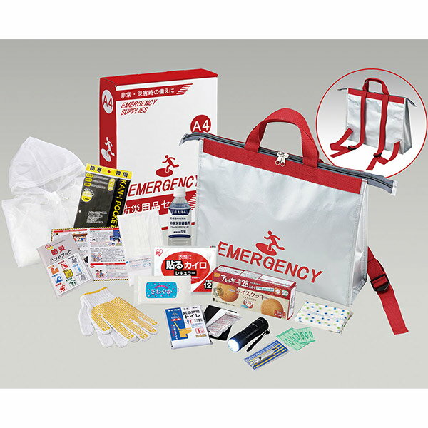 商品説明素材バッグ:不織布 箱サイズ21×31×7.2cm特徴 災害発生・避難勧告・避難指示発令時に避難場所への移動を素早く行うため、最低限必要な防災グッズをセットした避難セット。 A4サイズパッケージ入りで、書棚やデスクの引き出しに収納可能。 トート型リュックサックなので、すぐに持ち出し可能で背負って使えば両手も自由になり安全に避難できます。 ライトや緊急用ホイッスル、カイロに簡易トイレなどの災害時に役立つ防災グッズをひとまとめにした一人用防災セット。 オフィスやご自宅での備えに。家族一人に一つ、家族用にも備えておきたい防災セットです。セット内容避難用トートリュックバッグ強力9光ライト軍手マスク 防災ハンドブック傷バン(大小×各2)使い捨てカイロウェットティッシュ(20枚)ホイッスルポケットティッシュ 防寒レインコート緊急携帯トイレ(大小兼用)1P圧縮おしぼり4P備蓄用飲料水500㎖ライスクッキー