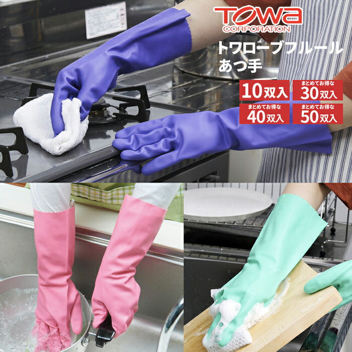 この商品のポイント 耐久性があり油や洗剤に強いビニルあつ手手袋です。 ●塩化ビニル製のため、天然ゴム製の手袋に比べて油や洗剤に強い手袋です。 ●耐久性のある丈夫なあつ手タイプです。 ●指、手のひらにスベリ止め加工を施しているため、グリップ性に優れています。 ●裏植毛付きのため、肌触りがよく着脱がスムーズです。 ●イヤなにおいを抑える抗菌防臭加工を施しています。 商品詳細 数 量 10双入 まとめてお得な30双入 まとめてお得な40双入 まとめてお得な50双入 サイズ M・L 全長/M/約32.0cm L/約32.0cm 品 質 塩化ビニル樹脂 裏/レーヨン・綿植毛 カラー ピンク(Mのみ)、グリーン、バイオレット 用 途 掃除、洗濯、洗車など メーカー 東和コーポレーション 注意事項 商品開封及びご使用後の返品・交換はできません。 メーカー欠品により商品をご用意できない場合は、その旨ご連絡をいたします。 商品画像はイメージであり実際の商品とはカラー等が異なって見える場合があります。 仕様は予告なくメーカーにより変更となる場合がございます。 販売価格はメーカー価格改定等の事情により、予告なく変更となる場合がございます。 ご使用になる際は商品の注意事項をお読みの上ご使用下さい。トワローブ フルールあつ手 掃除、洗濯、洗車などに 油や洗剤に強くて丈夫! 裏植毛付きで、肌触りがよく着脱がスムーズ
