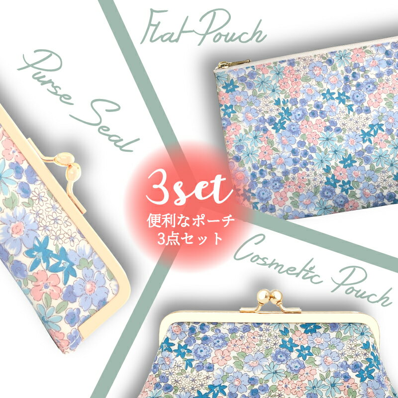 急上昇ワード【セット商品b ホワイトブルー】【3点セット】【リバティ風】【花柄】【かわいい おしゃれ 】 <Item comment> ↓ 〜セット内容〜 ●印鑑ケース*朱肉付き 可愛くてオシャレな銀行印が入る人気のガマ口印鑑ケースです。 開閉時に朱肉のフタが自動で開くため、フタを開ける手間を省けます! ●がま口コスメポーチ がま口が大きく開くので、中のアイテムを手間なく取り出せます。 ファンデーション、チークなどもしっかり入る大容量の収納力抜群の大き目ポーチです。 メガネケースとしても使える優れものです。 ●フラットポーチ マスクケースとしても人気のフラットポーチ 母子手帳ケース、お薬手帳ケース、通帳ケースに人気のフラットポーチです。 ●備考 表地の裏側はラミネート加工されているため、雨に濡れても簡単に染み込みません。 *印鑑ケースのPVC(塩ビ素材)はラミネート加工を施しておりません。 裏地は塩ビやナイロン100%生地を使用しているため、汚れてもサッと拭きとれます。 <素材> ●原産国:日本 ●表地:綿 100% ●裏地:(印鑑ケース)合成皮革(PVC) (がま口コスメポーチ・フラットポーチ)ナイロン100% ●その他:口金(メッキ:日本) ●サイズ(約): (印鑑ケース)本体 タテ 5cm × ヨコ 12cm × マチ 1cm (がま口コスメポーチ)本体 タテ 15cm × ヨコ 21cm × マチ 4cm (フラットポーチ)本体 タテ 12cm × ヨコ 19.5cm × マチ 2cm ※すべて日本製です。 <仕様> ●開口部:(印鑑ケース、がま口コスメポーチ)口金式、(フラットポーチ)ファスナー式 ●内側(印鑑ケース):朱肉×1(直径約1.3cmの印鑑が入ります) ※総柄のため1点づつ柄の出方が異なります。ご了承ください。 柔らかい色合いの13種類の花柄から選べます♪プレゼントにもおススメの商品です♪ ----------------------------------------------------------------------------------- 大人かわいい花柄で使い勝手抜群なポーチ3点セット! 15種類のバリエーション豊富な花柄からお選びいただけます。 すべて日本製にこだわったお洒落で可愛い安心の商品です。 大切な方へのプレゼントやギフトにも人気です♪ ----------------------------------------------------------------------------------- おすすめ商品 PIC UP ITEM 日本製本革トレーアクアレザー使用 日本製本革トレーアクアレザー使用 日本製本革トレーアクアレザー使用 日本製本革トレーアクアレザー使用 本革ピコタン風バッグ 本革ランチトートバッグ 本革日本製ミニウォレット ランキング1位獲得 日本製花柄印鑑ケース さりげないキティ柄 ミニトートバッグ 予備のマスク入れに 日本製花柄フラットポーチ