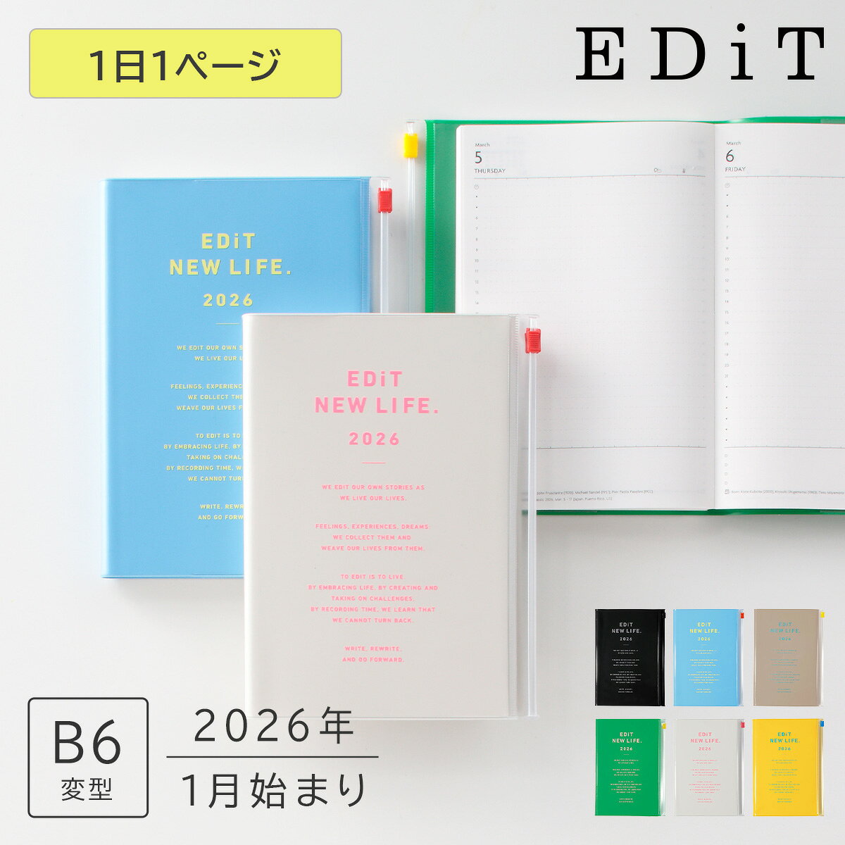 EDiTの定番人気のB6サイズの1日1ページ手帳。 配色のバランスがおしゃれな「タイポポケット」カバーが新登場。 カバーは、ランプブラック、セレストブルー、フレンチベージュ、ケリーグリーン、アイボリー、サンフラワーイエローの、ポップでおしゃれな全6色。 クリア素材で中身の見えるスライドジッパー付きポケットカバーには、手帳といっしょに持ち歩きたいペンや付せんなどの小物を収納できます。 予定・タスク管理だけでなく、日記帳やライフログ、アイデア用ノート、……使い方はあなた次第。1ページを広々と使いたい人におすすめのサイズの手帳です。 【1月始まり/464P】 ◎カバー付きサイズ/H188xW135xD19mm ◎重さ/約340g ◎カバー仕様/取り外し可能・スライドジッパー付リサイクル30パーセントPVCカバー・ペンホルダー付 ◎スピン2本付 【ポリ塩化ビニル(PVC)素材製品のご注意】 PVCは素材の特性上、プリンターで出力した用紙や写真等が長時間接触すると、印刷面がPVC側に色移りしたり貼り付いたりする恐れがあるため、直接製品に触れさせないでください。 リサイクルPVCについては、生地の製造工程上、黒い点状の混入物が発生することがございますが、不良品ではなく商品の仕様となります。 あしからずご了承ください。 「EDiT」2026年版手帳一覧はこちら日記帳、予定管理、ライフログ… 大人の上質な1日1ページ手帳 大人の上質な手帳として人気のEDiT手帳。なかでも人気NO.1の中面フォーマットが、この1日ページ手帳。手のひらサイズのB7、一番人気のB6、大判サイズのA5、と書く量と持ち運びやすさで選べる全3サイズをご用意しています。B6・B7サイズの1日1ページ手帳は、2012年日本文具大賞デザイン部門グランプリを受賞しました。 【デイリーページ】ユーザー次第でマルチに使える、自由度の高いノートタイプのデザイン 1. ドット罫の1日1ページ さりげないガイドラインでありつつ、書く人の思考を邪魔しない、自由度の高い5mm幅のドット罫を採用。文字だけでなくイラストや表も自由に書き込めます。 2. 24時間対応の時間軸 早朝や深夜の予定管理もできる24時間軸。1日の活動時間の中心となる6時から21時までを時間表示、その他の時間帯はドット表示です。 3. 罫線を引けるガイドポイント メインスペースに縦の罫線を引くためのガイドポイント。ページを2分割し、左スペースに予定管理、右スペースに予定の詳細、TO DOを記入する活用法が人気。 4. 祝日表示 日本は日本語表示、その他10の国・地域はアイコン表示です。 5. TO DOリスト タスク管理はもちろん、当日のトピックス、ひと言日記、レコーディングメモなど、自由な使い方ルールを考えてみても。 6. デイリーインフォメーション その日が誕生日、命日の著名人を掲載。俳優、アーティスト、スポーツ選手、科学者など。このほか、ノーベル賞をはじめ、アカデミー賞などの映画祭、ワールドカップなどのスポーツイベントやトレードショーまで幅広いセレクトの世界のイベント、国際デーやサマータイムなどの情報も掲載。 【マンスリーページ】1ヶ月の予定をひと目で把握できる月間ブロック 1ヶ月の予定が俯瞰しやすい、月間ブロックのマンスリーページ。その週の重要タスクやイベントがメモできる、ウィークリーTO DO欄付き。 【年間プランページ】1年の夢や目標を書き込んで、実現に向けてやることリストをつくります 1. 年間ビジョン 自由に使えるようにあえて罫線を入れていない、大きなテーマを書くフリースペース。マインドマップ、座右の銘や今年の一言、長めの文章を書きこむほか、写真を貼ったり、絵を描いたり。 この1年のスケジュールや時間の使い方で、優先順位をつけるときの「基準」であり「指針」となるのが、この年間ビジョンです。ワクワクしたり、ときめいたり、満たされる、そんな感覚が持てる、心から「実現したい!」と思えるイメージを描き、このスペースに記入しましょう。 2. 年間プラン “その年に実現したい10のこと”を記入。 具体的に書くことで、意識づけも図られ、自分への刺激にもなります。何をどれくらい実行するのか、より現実的な行動を書くのがポイントです。 たとえば、“1ヶ月に3冊、本を読む”とか“30人以上の方と名刺交換する”など、より具体的に表現しましょう。そしてそれを実行する週間や日時を決めて、マンスリーページやデイリーページに記載していきます。 3. マンスリーイベント プライベートのイベントや、友人の誕生日をまとめて書きこんだりするほか、月ごとの数字目標などを記入して、仕事の予算や実績管理にも活用できます。 左ページのプランリストを、月単位の時間軸に落としこみ、月ごとの目標やTO DOを記入しても。 【月間プランページ】年間プランを起点に、1ヶ月単位の計画や記録を書きこみます 1. 今月のテーマ 年間プランページを見ながら、書きたいページ。1ヶ月のテーマを決めて、新しい月をスタート。気持ちの切り替えにもつながります。 2. 月間
