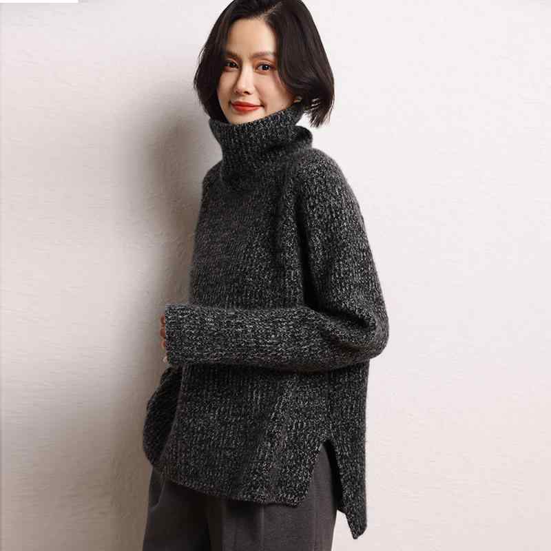 ニット レディース 秋冬 カシミヤ混 ウール混 ハイネック スリット 厚手 ゆったり オーバーサイズ プルオーバー 長袖 セーター 前後差 ヘムライン 通勤 オフィス 体型カバー 上品 無地