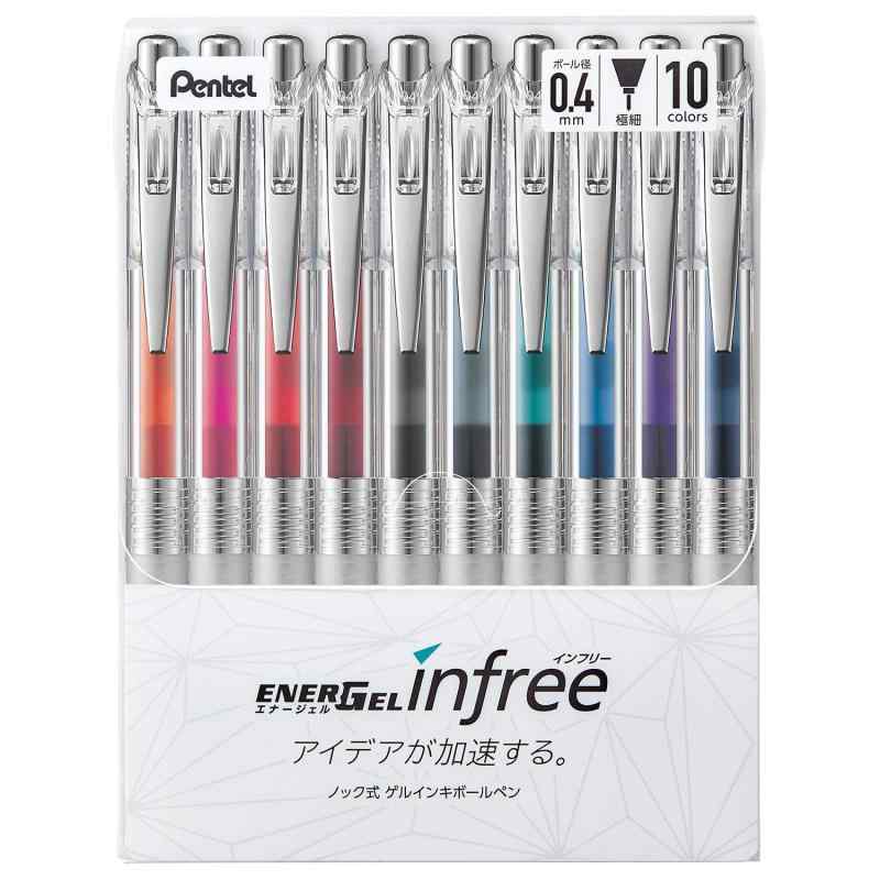ぺんてる ボールペン ゲルインキ エナージェル インフリー 0.4mm クリア軸 BLN74TL-10 10色