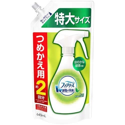布の奥まで3D浸透! 布製品の消臭・除菌ができるスプレーです。 消臭・除菌成分が繊維の1本1本にまでスピーディーに広がり、ニオイの元に素早く働きかけます。 細かいミスト。噴射エリアが広がり消臭効果が25%アップ(従来品比)。 ほのかな緑茶の香り。 ファブリーズダブル除菌+消臭ほのかな緑茶の香りのボトルに詰め替えてお使いください。 パッケージ・内容等予告なく変更する場合がございます。予めご了承ください。 名称 ファブリーズ W除菌 緑茶成分入り つめかえ用 特大サイズ 640mL 成分 トウモロコシ由来消臭成分、除菌成分、香料 容量 640mL 原産国 日本 メーカー P&G 広告文責 株式会社LUXSEED 092-710-7408 配送について 代金引換はご利用いただけませんのでご了承くださいませ。 通常ご入金確認が取れてから3日〜1週間でお届けいたしますが、物流の状況により2週間ほどお時間をいただくこともございます また、この商品は通常メーカーの在庫商品となっておりますので、メーカー在庫切れの場合がございます。その場合はキャンセルさせていただくこともございますのでご了承くださいませ。 送料 送料無料