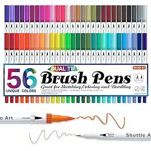 Shuttle Art Dual Brush Pens Art Markers, 56 Colors Dual Tip Calligraphy Pens Fineliner and Brush Tip perfect for Kids Adult Artist, Hand Lettering, Journal, Doodling, Writing, Coloring Books.