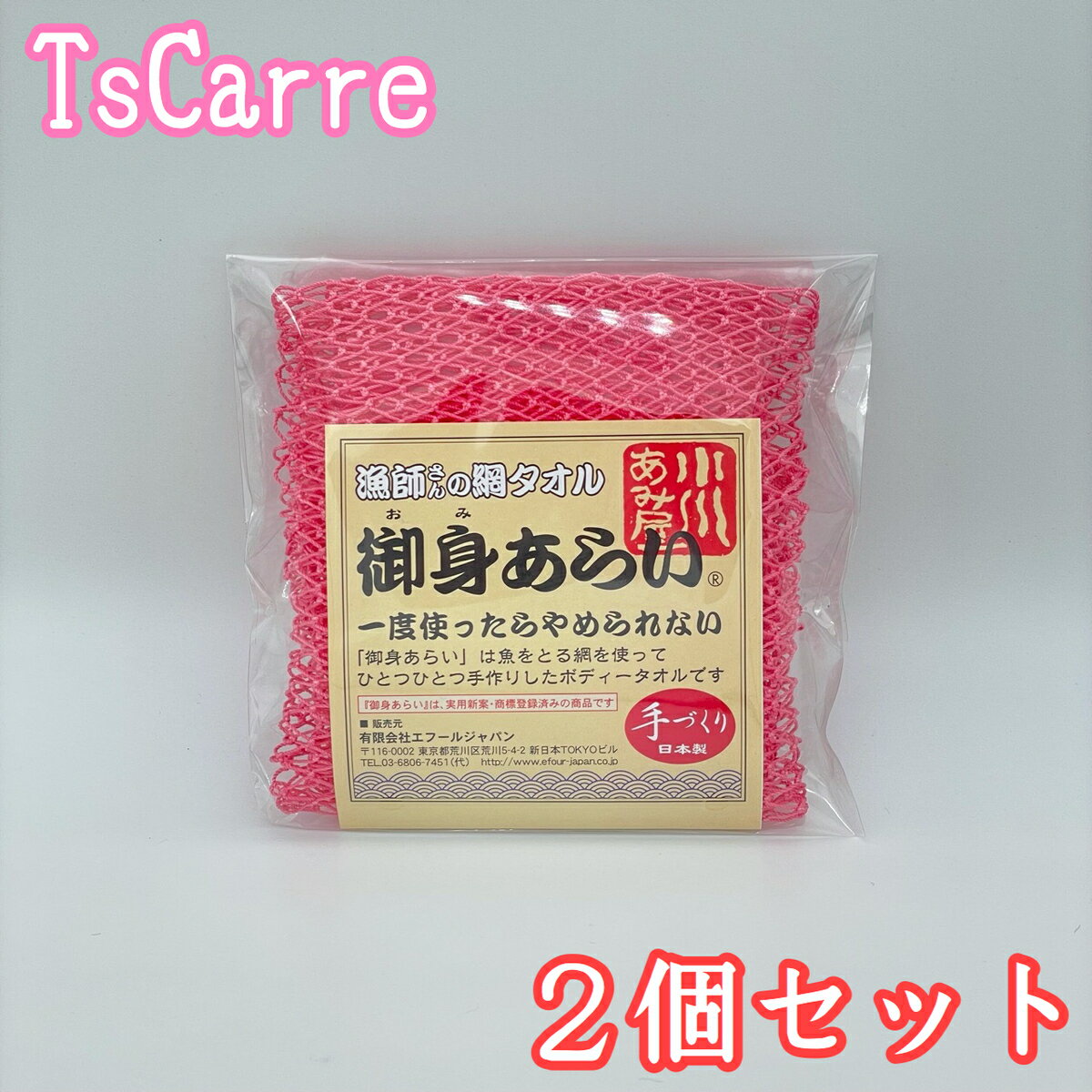 商品情報セット内容漁師さんの網タオル 御身あらい(ピンク) × 2特徴石鹸、ソープは少しで抜群の泡立ち使用感!すすぎが簡単・丈夫で長持ち・環境に優しい。使用方法●網をお湯に浸し石鹸をつけ、網を揉み泡立ててご使用下さい。●使用後はよくすすいで下さい。注意事項●皮膚の弱い方は強くこすり過ぎないで下さい。●異常がある場合は使用をやめ皮膚科などにご相談下さい。●若干の色落ち、染めむらがございます。サイズ[使用前] 約37×12cm[使用後] 約110×5cm素材本体・ひも:ナイロン 100%生産国日本メーカー名有限会社エフールジャパン広告文責株式会社TプロTEL: 03-3425-8796E-mail: shop@tpro.club漁師さんの網タオル 御身あらい(ピンク) 2個セット エフールジャパン 小川漁網商店 漁師さんの網タオル ピンク 手づくり 日本製 2個セット 漁師さんが海で使う本物の漁網を使って作りました。ひとつひとつ手作りの浴用ボディタオルです。本物の漁網を使用しているために耐久性や水切れもよく、泡立ちに優れ大変衛生的です。両手ひもがついていますので、体のすみずみまで簡単に洗え、網目が心地よい刺激となって快適なバスタイムがお楽しみいただけます。地球環境にも優しい商品です。※こちらの商品はゆうパケットで発送させていただきます。日時指定はできませんので予めご了承ください。 5