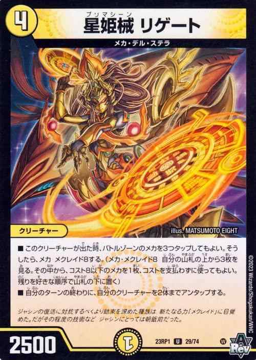 デュエルマスターズ 星姫械 リゲート(アンコモン) 双竜戦記(DM23-RP1) | デュエマ 光文明デュエルマスターズシングルカードデュエルマスターズTCG アビス・レボリューション第1弾「双竜戦記」(DM23-RP1)収録 カード名:星姫械 リゲート Card Name:Rigate, Primachine レアリティ:アンコモン 種類:クリーチャー 文明:光文明 種族:メカ・デル・ステラ パワー:2500 コスト