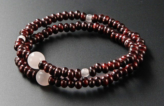 【メール便送料無料♪】数珠ブレスレット パワーストーン数珠 108珠 紫檀・紅水晶 京念珠 腕輪念珠 腕輪数珠 Bracelet 女性用 男性用 レディース メンズ パワーストーンブレスレット 天然石ブレスレット パワーストーン ローズクォーツ 天然石 紅水晶 ラブストーン 天然木 木製 シタン商品説明 ☆メール便送料無料♪ ※メール便発送の商品です!! 「日時指定不可」「代引利用不可」 ご了承ください。 【二重腕輪念珠】デザインがお念珠のミニチュア版になっています。 京念珠 腕輪念珠 腕輪数珠 Bracelet 数珠ブレスレット パワーストーン数珠 パワーストーンブレスレット 天然石ブレスレット サイズ 腕回り : 約 17センチ (内周) 5×3ミリ玉 × 108粒 8ミリ玉 × 2粒 4ミリ玉 × 4粒 素材 【紅水晶】 【ローズクォーツ】 【ラブストーン】 産地 : ブラジル・インド 正式名称 : 天然クォーツ ・ ローズクォーツ 【紫檀】 (シタン) 産地 : 東南アジア 正式名称 : ローズウッド オペロンゴムを3重に通しております。 オペロンゴムは、繊維状のゴムを幾重にも束ね、 石の「吸い付き」を良くしたゴムです。 概要 【紅水晶】 【ローズクォーツ】 【ラブストーン】 紅水晶・ローズクォーツは「美・愛・優しさ」を象徴する石です。 紅水晶・ローズクォーツは、クォーツ(石英)の変種でピンク色のものをいい、別名を『バラ石英』と呼ばれることがあります。 日本では透明度の高いものを"水晶"、低いものを"石英"と認識しているため、透明度の高いローズクォーツを"紅水晶"と呼ぶ傾向があるようです。 【紫檀】 (シタン) (艶有り) 美麗な心材と、薔薇のような香りを併せ持つ、 マメ科の木材を『ローズウッド』と総称しますが、 東南アジアを代表する、東のローズウッドの王様が、 この紫檀です。 高級木材『唐木』の一種としても知られ、 非常に知名度が高く人気の銘木材です。 二重腕輪念珠 108珠 人間には108の煩悩があると言われております。 念珠の珠は正式には108玉あり、 一つ一つが108の煩悩を司る仏様を表していますので、 人間のあらゆる煩悩を念珠が受けてくれると言われております。 厄除けやお守りとしての役目をしています。 付属品 ☆プラスチックケース入り 宗派 すべての宗派で使える、数珠ブレスレッド・パワーストーンブレスレッド・天然石ブレスレットです。 備考欄 京都珠数製造卸組合加盟店 謹製 ※ 実物と画像イメージは異なる場合がございますのでご了承下さい。