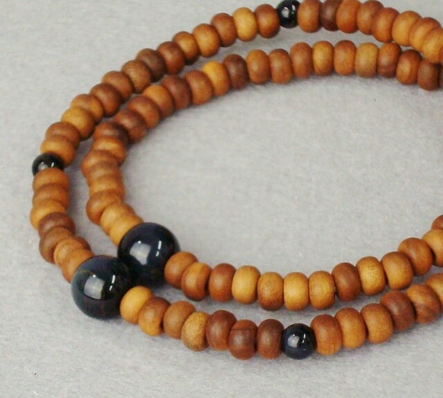 【送料無料♪】 数珠ブレスレット 栴檀 虎目石 黒オニキス 108珠 京念珠 腕輪念珠 腕輪数珠 Bracelet 女性用 男性用 虎眼石 黒オニキス 木製 天然木 天然石商品説明 ☆メール便送料無料♪ ※メール便発送の商品です!! 「日時指定不可」「代引利用不可」 ご了承ください。 デザインがお念珠のミニチュア版になっています。 人間には108の煩悩があると言われております。 念珠の珠は正式には108玉あり、 一つ一つが108の煩悩を司る仏様を表しています。 サイズ 約 17センチ (内周) 5×3ミリ玉 × 108粒 【栴檀】(艶有り) 8ミリ玉 × 1粒 【虎目石/虎眼石】 8ミリ玉 × 1粒 【黒瑪瑙】 4ミリ玉 × 2粒 【虎目石/虎眼石】 4ミリ玉 × 2粒 【黒瑪瑙】 素材 【虎目石/虎眼石/タイガーアイ】 産地 : 南アフリカ・中国 正式名称 : 天然クォーツ(多結晶質)・ タイガーアイ 【黒瑪瑙 / ブラックオニキス】 産地 : ブラジル・インド 正式名称 : 天然クォーツ(多結晶質)・ ブラックアゲート 【栴檀】 産地:西日本を含むアジア各地の熱帯・亜熱帯域に自生する。 正式名称 : センダン オペロンゴムを3重に通しております。 オペロンゴムは、繊維状のゴムを幾重にも束ね、 石の「吸い付き」を良くしたゴムです。 概要 【虎目石/虎眼石 / タイガーアイ】 虎目石は、光の反射で変化する金褐色に縞模様が入り虎の目のように大変美しい輝きを放つ天然石です。 100%天然の石ですので、色の混じり方は様々です。 古くより虎の眼のごとく『すべてを見通す眼』と考えられてきました。 【黒瑪瑙 / ブラックオニキス】 オニキス(黒瑪瑙)は、ギリシア語の「爪(Onyxis)」に由来し名づけられた名前です。 オニキスは古くから魔よけの護符として使用されてきました。 元々は縞模様のあるアゲートをオニキスと呼んでいたのですが、現在はほぼ黒色のアゲートの事をオニキスと呼んでいます。 日本では、『瑪瑙(めのう)』と呼ばれます。 アゲートは微細な石英の結晶が集まってできた石で、カルセドニと基本的に同じ鉱物なのですが、色むらが少なく一定のものをカルセドニ、縞などの様 が存在するものをアゲートと呼んで区別しています。 【栴檀 / せんだん】 栴檀は、欅に木目が似ている日本の銘木です。 淡黄褐色に茶褐色の木目が美しい木材です。 独特の木の香がし自然の癒しが感じられます。 付属品 ☆プラスチックケース入り 宗派 すべての宗派で使える、数珠ブレスレット・パワーストーン数珠・パワーストーンブレスレッド・天然木 天然石ブレスレットです。 備考欄 京都珠数製造卸組合加盟店 謹製 ※実物と画像イメージは多少色味が異なる場合がございますのでご了承下さい。
