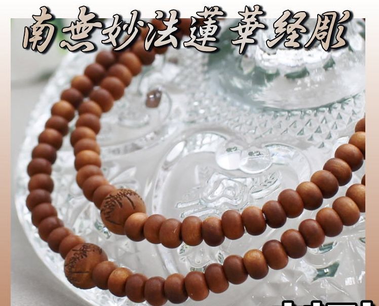【送料無料♪】数珠ブレスレット 108珠 小 白檀 法華彫 サンダルウッド 御題目彫 (親玉) 南無妙法蓮華経彫 京念珠 腕輪念珠 腕輪数珠 Bracelet 木製 香木 天然木ブレスレット 女性用 男性用 レディース メンズ 木製 天然木 香木 お香 白檀 サンダルウッド商品説明 香木で造られたブレスレットです! お香の優しい香りがします! デザインがお念珠のミニチュア版になっています。 古来より人の心をとらえ、高貴にして貴重なものとして、大切に扱われてきた香木・白檀に、御題目の南無妙法蓮華経が親玉にレーザー彫りされています。 ふくよかで優美な心打つ香りを味わって頂くことが出来ます。 着色などを一切施していない天然木ですので、持つほどに光沢が増し、自分色に染まりゆく変化が楽しめるのも大きな醍醐味です。 オペロンゴムを4重に通しております。 【白檀 / サンダルウッド】 白檀とはビャクダン科の常緑小高木です。 沈香が熱を加えない限り香りを発しないのと異なり、白檀は生の状態でも芳香を放ちます。 そのことから、置物である仏像、仏教儀式に欠かせない数珠等の仏具をはじめとして、日本では扇子の骨に使ってあおぐことで香りを発散させたり、匂い袋の香料の一つに利用するなど、身近なところで多種多様に使われています。 線香の原料の中では最も一般的です。 サイズ 二重にした状態の内周 : 約 16センチ 広いた状態の内周 : 約 34センチ 5ミリ×3ミリ玉 × 108粒 8.5ミリ×7ミリ玉 × 2粒【南無妙法蓮華経彫】 5.5×4ミリ玉 × 4粒 四天の方が主玉より大きい作りになっています。 素材 【白檀 / サンダルウッド】 和名 : 白檀(びゃくだん) 英語 : サンダルウッド 産地 : インド、インドネシア、オーストラリア 【レーザー彫】 御題目(南無妙法蓮華経) 概要 【お題目 / 南無妙法蓮華経】 日蓮聖人は、「南無妙法蓮華経」はお釈迦様が我々に残してくださった薬であると説かれています。南無妙法蓮華経のお題目を唱えることにより、自然とお釈迦様の功徳と智慧が備わり、佛に成ることが出来ると述べられています。 【白檀 / サンダルウッド】 清楚、優雅、幽玄な甘い香りが特徴で、その香りは優れた持続性をもちます。 ヨガやアーユルヴェーダの瞑想や宗教的儀式によく用いられます。 付属品 ☆プラスチックケース入り 宗派 日蓮宗 備考欄 ☆送料無料♪ 京都珠数製造卸組合加盟店 謹製 ※ 実物と画像イメージは多少色味が異なる場合がございますのでご了承下さい。 ▼サイズ違いもございます♪