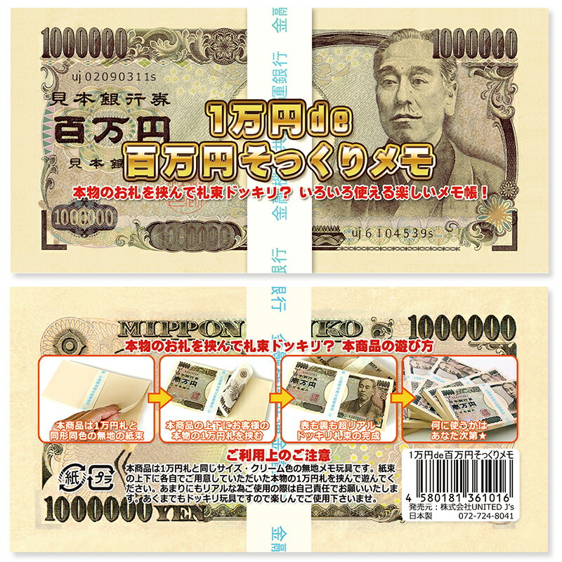 商品詳細 名称 1万円de百万円メモ 原材料 紙・フィルム外包 内容量 約100g 保存方法 直射日光や湿度の高い場所はお避け下さい。 原産国 日本 使用方法 本商品の無地メモ帳に本物の一万円を挟んでご使用ください。あまりにもリアルな為、ご使用の際は自己責任でお願いいたします。あくまでもドッキリ玩具ですので、楽しんでご使用くださいませ。 発送方法 9束まではメール便・10束以上は宅急便 商品詳細 名称 1万円de百万円メモ 原材料 紙・フィルム外包 内容量 約100g 保存方法 直射日光や湿度の高い場所はお避け下さい。 原産国 日本 使用方法 本商品の無地メモ帳に本物の一万円を挟んでご使用ください。あまりにもリアルな為、ご使用の際は自己責任でお願いいたします。あくまでもドッキリ玩具ですので、楽しんでご使用くださいませ。 発送方法 9冊まではメール便・10冊以上は宅急便