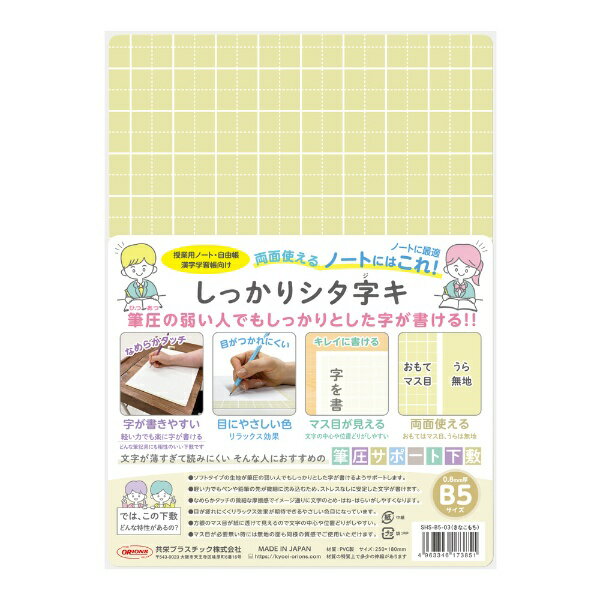 手帳のしっかりシタ字キ しっかりした字が書ける手帳のしっかりシタ字キは SDGsの目標4「質の高い教育をみんなに」をテーマに開発された社会問題解決型の下敷です。「書いた文字が薄すぎて読めない」そんな人にオススメ!筆圧が弱くてもなめらかタッチの書き心地で軽い力でもしっかりした字が楽に書けます。厚すぎず、薄すぎず、やわらかすぎず、硬すぎず、手帳やノートに最適な下敷●ソフトタイプの生地が筆圧の弱い人でもしっかりとした字が書けるようサポートします。●軽い力でもペンや鉛筆の先が微細に沈み込むため、ストレスなしに安定した文字が書けます。●なめらかタッチのスムーズな摩擦感でイメージ通りに文字のとめ・はね・はらいがしやすくなります。●目が疲れにくくリラックス効果が期待できるやさしい色目になっています。●方眼のマス目が紙に透けて見えるので文字の中心や位置どりがしやすい下敷です。●マス目が必要無い時には無地の裏面でもご使用いただけます。●敷くことでやわらかなタッチになり静かな場所での「文字を書く音」を軽減します。●0.8mm厚の軟質生地が複写にも最適で、筆圧が弱い人でもしっかりと写り込みます。●捺印マットにも最適なクッション性で、オフィスグッズとしてしっかりお仕事をサポート。●インデックス付きでしおり代わりになるので挟むだけで見たいページがすぐに判ります。●万年筆、ボールペン、シャーペン、筆ペン、鉛筆等どんな筆記具にも効果を発揮。サイズ:縦225(mm)×横148(mm)×厚0.8(mm)本体:軟質PVC製リバーシブル:表面/方眼、裏面/無地ソフトタイプ軟質下敷