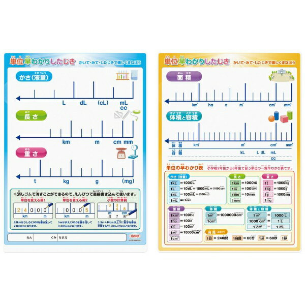 単位の勉強が、書いて、見て、感覚的に学べる下敷です!下敷に鉛筆で書き込んで、消しゴムで消せる新発想の下敷。小学校2年生から6年生で習う単位の一覧早わかり表と名前記入欄付き。表面には「かさ・液量」「長さ」「重さ」の単位書き込み欄があります。裏面は「面積」「体積と容積」の単位書き込み欄と単位早わかり表が載っています。・サイズ:縦250(mm)×横180(mm)×厚0.6(mm)・素材:[本体]硬質塩化ビニール樹脂製・規格:B5判下敷・書き消し機能付