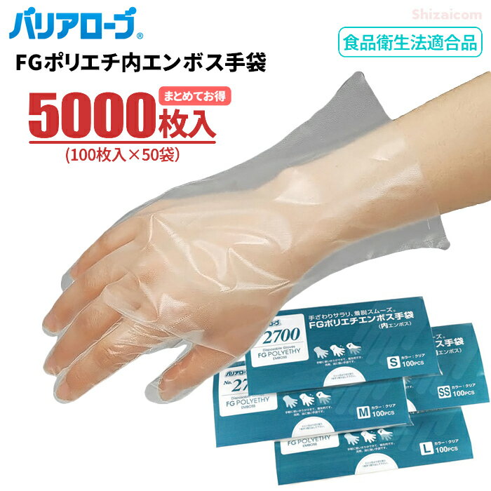 この商品のポイント 幅広い用途にお使いいただける使い切りタイプのポリエチレン手袋です。 ●内エンボス加工で着脱が容易でベタつきにくく、サラリとした使用感。 ●酸・アルカリ、油脂に強いポリエチレン製の手袋です。 ●手袋を頻繁に取り替える作業に便利です。 ●便利な左右兼用タイプのためムダなくお使いいただけます。 ●調理など食品の扱いにも安心の食品衛生法適合 商品詳細 数 量 5000枚入り(100枚入×50袋) サイズ SS・S・M・L (左右兼用) 全長/約28cm 品 質 ポリエチレン カラー クリア 用 途 食品加工・水産加工・調理・半導体・バイオ産業・印刷作業・その他軽作業、汚れ作業に メーカー リーブル株式会社 注意事項 この商品は衛生品につき返品・交換はできません。 メーカー欠品により商品をご用意できない場合は、その旨ご連絡をいたします。 商品画像はイメージであり実際の商品とはカラー等が異なって見える場合があります。 仕様は予告なくメーカーにより変更となる場合がございます。 販売価格はメーカー価格改定等の事情により、予告なく変更となる場合がございます。 ご使用になる際は商品の注意事項をお読みの上ご使用下さい。バリアローブ FGポリエチ内エンボス手袋 5000枚入 (100枚入×50袋) 幅広い用途に ベタつきにくくサラリとした使用感 食品の扱いにも安心の食品衛生法適合