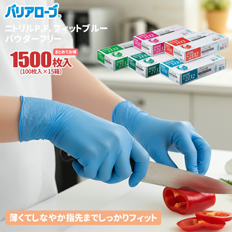 この商品のポイント 素手感覚で指先までよくフィット、従来品よりさらに薄く仕上げた、しなやかで使いやすい手袋です。 ノンパウダーですので、異物混入を防ぎたい食品の扱いやクリーン作業に適した手袋です。 ●着脱のスムーズなクロリネーション加工を施しています。 ●指先エンボス加工でスベリにくく細かな指先作業に適しています。 ●ニトリルゴムグローブは合成ゴム製でラテックスアレルギーの方でも手荒れをおこしにくい手袋です。 ●素材のニトリルゴムは耐油性・耐薬品性に優れています。 ●食品や材料などに紛れても見失いにくい安心のカラー(目に優しいティールブルー)です。 ●食品の扱いにも安心の食品衛生法適合品 商品詳細 数 量 1,500枚入(100枚入×15箱セット) サイズ SS・S・M・L・LL (左右兼用) 全長:約24cm 品 質 ニトリルゴム(粉なしタイプ) カラー ブルー 用 途 食品加工、水産加工、食肉加工、厨房機器のメンテナンス、工場用内軽作業、油類の取扱いなどに メーカー リーブル株式会社 注意事項 この商品は衛生品につき返品・交換はできません。 メーカー欠品により商品をご用意できない場合は、その旨ご連絡をいたします。 商品画像はイメージであり実際の商品とはカラー等が異なって見える場合があります。 仕様は予告なくメーカーにより変更となる場合がございます。 販売価格はメーカー価格改定等の事情により、予告なく変更となる場合がございます。 ご使用になる際は商品の注意事項をお読みの上ご使用下さい。バリアローブ ニトリルP.F.フィット ブルー 1,500枚入 (100枚入×15箱セット) 指先までピッタリフィット スベリにくい指先エンボス加工 食品の扱いにも安心の食品衛生法適合品
