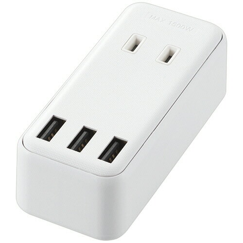 ●2つのAC差込口と3つのUSBポートが一体になったモバイルUSBタップ、本体色はホワイトです。●コンセントにそのまま接続する直差しタイプで、コンセントの口を塞がない横差しタイプです。●USBポートを3ポート搭載しており、スマートフォンなどを3台同時に充電可能です。3ポート合計最大2.4Aの出力が可能です。●USBポートに搭載した高性能ICが接続機器を自動で見分けて適した出力で最速に充電できる「おまかせ充電」に対応しています。●AC差込口には、未使用時にほこりの侵入を防止する「ほこり防止シャッター」を装備しています。●AC差込口には、万一の発熱の際にも融解しにくく、電気火災の防止に有効な耐熱性に優れたユリア樹脂を使用しています。●ACプラグの根本に絶縁キャップがついており、トラッキング現象による火災の防止に役立ちます。●USB充電部に10年使える長寿命設計を実現しています。●色/ホワイト●コンセント仕様/2P●コンセント数/2個口●プラグ形状/2P・固定式●コネクタ形状/USB Aメス×3●材質/[本体]ABS樹脂、[差込口]ユリア樹脂●対応機種/iPhoneおよびUSB端子で充電するスマートフォン●定格容量/USB側:5V/合計最大2.4A(1ポート最大2.4A)、AC側:125V 15A 1500W●寸法/W40×D90×H31mm●質量/約85g●保証期間/1年※充電に必要な各種ケーブルは同梱していません。別途お買い求めの上、ご使用下さい。●メーカー/エレコム●型番/MOT-U08-23WH●JANコード/4549550117272※メーカー都合によりパッケージ・仕様等が予告なく変更される場合がございます。ご了承ください。本商品は自社サイトでも販売しているため、ご注文のタイミングにより、発送までにお時間をいただいたり、やむをえずキャンセルさせていただく場合がございます。※沖縄へのお届けは別途1650円(税込)の送料がかかります。※本商品はメーカーより取寄せ後の発送となるため、配送日はご指定頂けません。予めご了承ください。また、ご注文後のキャンセル・返品はお受けできません。予めご了承ください。