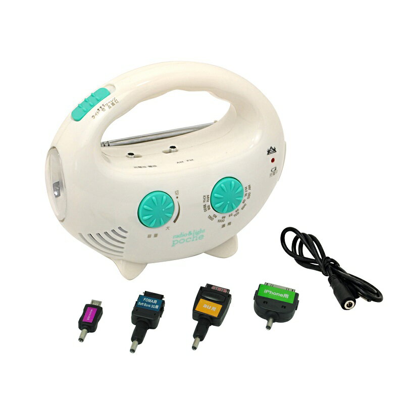 ◆優しい色合いの可愛らしい多機能ラジオライト! ◆ダイナモ発電が出来ます。ハンドルを10分間まわすとLEDサーチライトが約50〜80分間、ラジオが約100〜150分間使用できます。 ◆携帯電話充電機能付。※PHSには使用出来ません。DoCoMo、au、SoftBank、FOMA、3Gのほとんどに対応しておりますが、一部の機種で使用出来ない機種がございます。ご了承下さい。(iPhone4Sまで対応) 【商品仕様】 AM/FMラジオ(AM/540kHz〜1600kHz・FM/76MHz〜108MHz)、LEDサーチライト、サイレン&点滅灯、ダイナモ発電、携帯電話充電機能付(携帯電話充電用コード・携帯電話充電用アタッチメント4種[docomo・SoftBank・au・iPhone〈4Sまで〉・microUSB ]) ※地域・地形などの影響により電波を受信できない場合がございます。 ●材質:ABS樹脂 ●サイズ:130×155×75mm/重量:320g ※モニターの種類やパソコンの環境によって実際の商品の色合いが若干異なる場合がございますのでご注意ください。 ※こちらの製品はメーカー直送品の為、製造メーカーにて欠品の場合は、誠に勝手ながらキャンセルをさせていただく場合が御座いますのであらかじめご了承下さい。 又、メーカー直送品の為、他の製品との同一梱包は不可となりますので、ご了承願います。 ※沖縄・離島に関しましては、地域毎に送料が異なりますので、別途ご相談ください。
