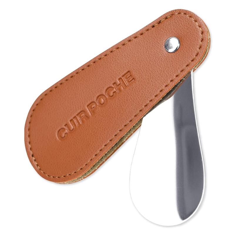 CUIR POCHE 靴べら シューホーン 携帯 おしゃれ レザー調 カバー付き ロック機能 傷つき防止 撥水加工 防汚加工 ステンレス 軽量 ビジネス ゴルフ メンズ レディース