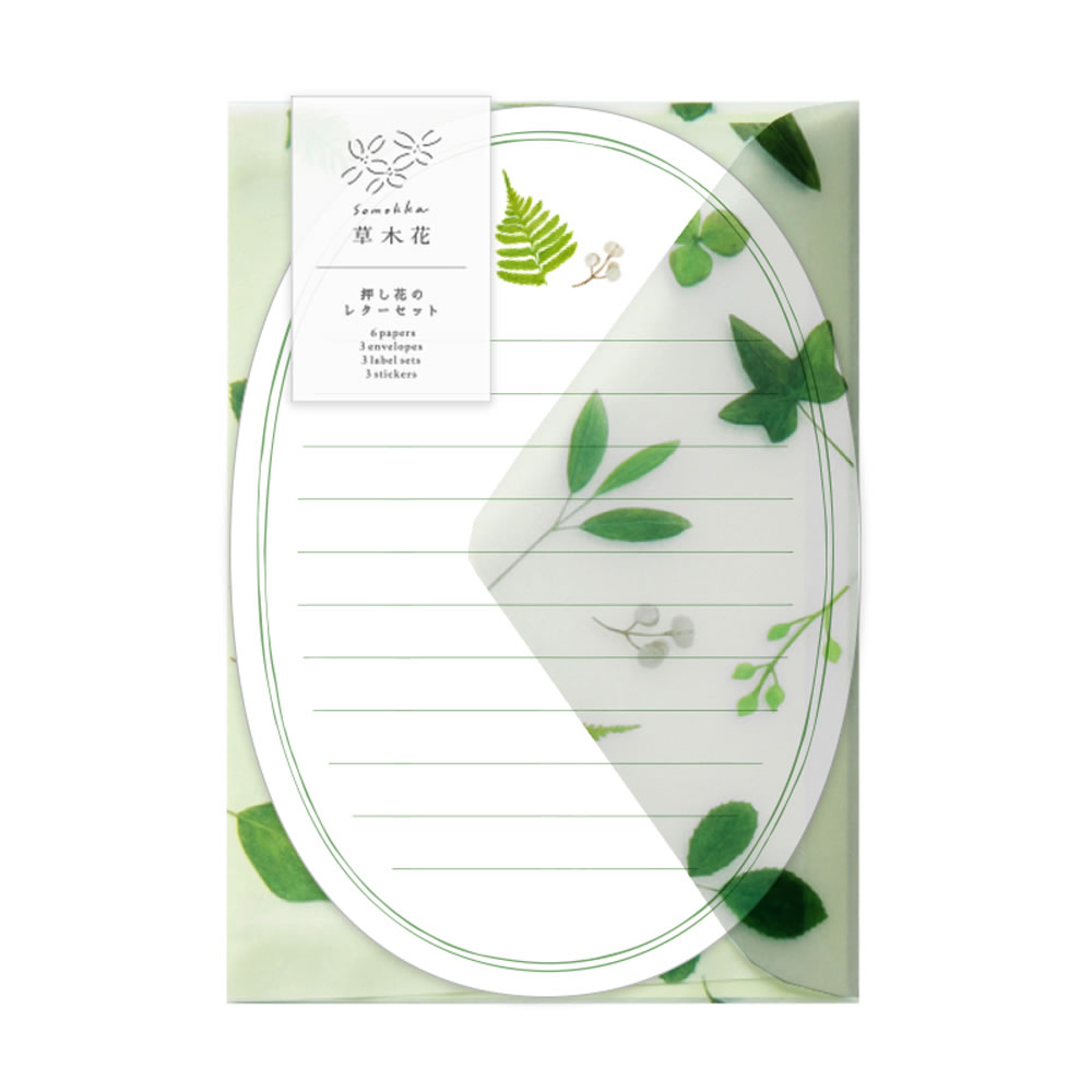 草木花 (ソウモッカ) 押し花のレターセット グリーン SMLS-03 (15) 便箋6枚・封筒3枚・宛名ラベル3セット・封緘シール3枚 リュリュ