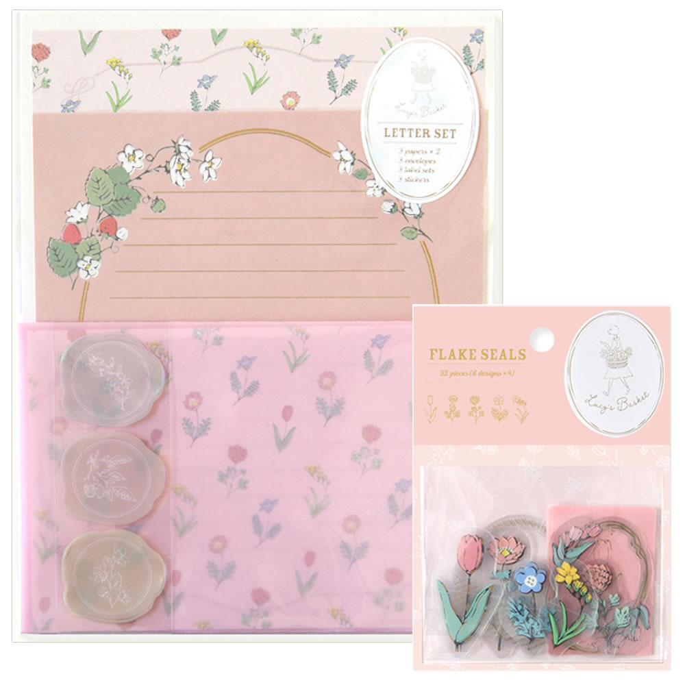 リュリュ ルーシーズバスケット レターセット&フレークシール チューリップ・ピンク LBLS-01/LBFS-01 (24) 便箋6枚・封筒3枚・シール32枚 RYU-RYU