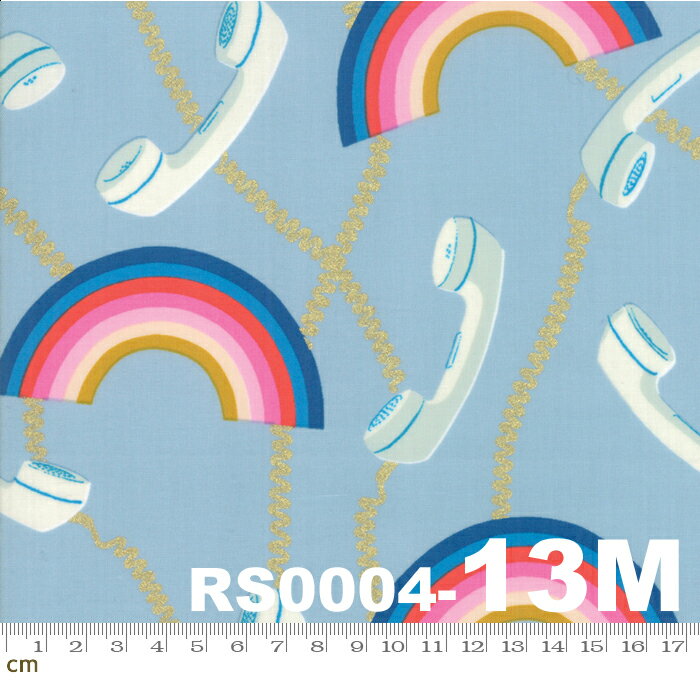 【ruby star】Social-RS0004-13M(メタリック加工)(2D-02) 水色 ライトブルー ゴールド モチーフ柄 虹柄 電話 受話器柄 レトロポップ プリント コットン ルビースター コットン100% シーチング 110cm幅【10cm単位販売】