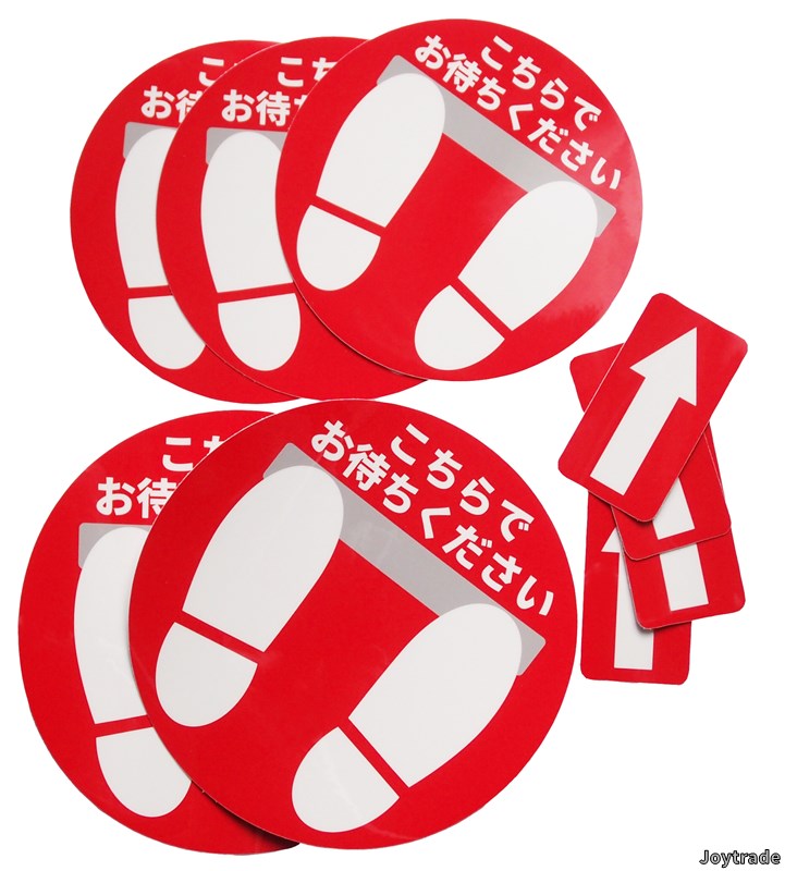 ◆商品 ソーシャルディスタンス用に 足型フロアシール 円形ミニ足型5枚とミニ矢印4枚のセット 直径約14cmと16.5cm、2サイズの円形ミニ足型5枚とミニ矢印4枚のセットです。 ◆説明 表面材質:硬度9Hガラスコーティング 中層:形状記憶PETフィルム 印刷面:塩化ビニール 接着剤:アクリル系樹脂接着剤 製造国:日本 ・表面に硬度9H相当のハードコーティングシートを貼っており、耐久性・耐熱性に優れ、輝きが持続します。 ・防滑加工済みだから、きれいさ長持ちながら滑りにくい。 ・剥がした後も安心!床を汚さない糊残りの少ない接着剤を使用。 ※凸凹のある床材や油分のある床面、ワックスの塗ってある床面には貼れません。平らな鏡面床材でシールが確実に付く床面に適しています。ワックスが塗ってある場合はワックス剥離剤で落としてから貼ってください。 ※細部のデザインや表記は予告なく変更することがあります。また、表記の正確性を保証するものではありません。 ※商品は製造ロット等により、A3サイズの台紙に貼り付ける場合と、個別の形状ごとに台紙ごとカットしたものをまとめて梱包する場合があります。 ◆よくあるご質問 ・シールは簡単に貼れますか? ・どなたでも簡単に貼ることができます。 ・シールの表面は滑りやすくないですか? ・表面に防滑加工をしておりますので滑り難くなっています。 ・表面に付いた汚れはどうやれば取れますか? ・硬く絞った雑巾で拭いてください。油汚れやヒール痕などはアルコールで拭いてください。 ・どんな床にも貼れますか? ・凸凹のある床材や油分のある床面、ワックスの塗ってある床面には貼れません。平らな鏡面床材でシールが確実に付く床面に適しています。 ・貼り直しはできますか? ・糊の粘着力が落ちますのでお勧めしません。 ・耐久性は? ・お客様の来店数にもよりますが、概ね1年程度となります。 <注意事項> ・硬いものでシール表面を叩いたり、擦ったりしないでください。 ・ポリッシャー(床磨き機)等でシール表面を清掃するのは避けてください。 ・表面のハードコーティングシートが割れますのでシールを折り曲げないでください。ハードコーティングシール共通説明 ソーシャルディスタンス用に 足型フロアシール 円形ミニ足型5枚とミニ矢印4枚のセット