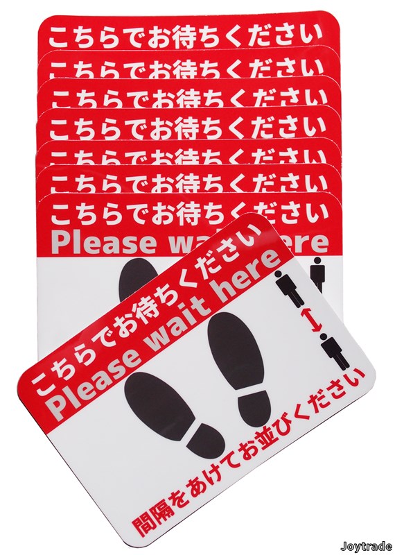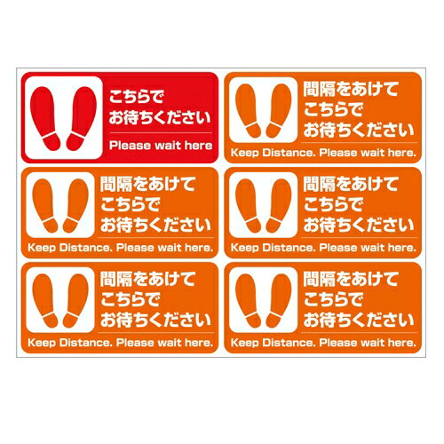 A4サイズ足型フロアシール こちらでお待ちください Please wait hre A4サイズの足型シールです。お店の床に貼る誘導案内フロアシール フロア、レジ前など お店の床に貼るシール ソーシャルディスタンス確保用として、お客様に間隔を空けて並んで頂く為の、お店の床に貼るフロア誘導シール。レジ待ち立ち位置を床に表示し、お買い物客同士の距離を保つ誘導用に 列に並ぶお客様に距離を取って並んで頂くための誘導案内シール フロア、レジ前など お店の床に貼るソーシャルディスタンス用フロアシール。 表面にラミネートしたハードコーティングフィルムで傷や汚れにも強い! 0.26mmのしっかりした厚みのあるシールで、強粘着、再剥離。剥がしても床面に糊残りがありません。 ※凸凹のある床面や油分のある床面、ワックスが塗ってある床面などシールが付かない床面への使用はできませんのでご注意ください。 ※製造国:日本 ◆説明 表面材質:硬度9Hガラスコーティング 中層:形状記憶PETフィルム 印刷面:塩化ビニール 接着剤:アクリル系樹脂粘着剤 製造国:日本 ・表面に硬度9H相当のハードコーティングシートを貼っており、耐久性・耐熱性に優れ、輝きが持続します。 ・防滑加工済みだから、きれいさ長持ちながら滑りにくい。 ・剥がした後も安心!床を汚さない糊残りの少ない接着剤を使用。 ※凸凹のある床材や油分のある床面、ワックスの塗ってある床面には貼れません。平らな鏡面床材でシールが確実に付く床面に適しています。ワックスが塗ってある場合はワックス剥離剤で落としてから貼ってください。 ※細部のデザインや表記は予告なく変更することがあります。また、表記の正確性を保証するものではありません。 ※商品は製造ロット等により、A3サイズの台紙に貼り付ける場合と、個別の形状ごとに台紙ごとカットしたものをまとめて梱包する場合があります。 ◆よくあるご質問 ・シールは簡単に貼れますか? ・どなたでも簡単に貼ることができます。 ・シールの表面は滑りやすくないですか? ・表面に防滑加工をしておりますので滑り難くなっています。 ・表面に付いた汚れはどうやれば取れますか? ・硬く絞った雑巾で拭いてください。油汚れやヒール痕などはアルコールで拭いてください。 ・どんな床にも貼れますか? ・凸凹のある床材や油分のある床面、ワックスの塗ってある床面には貼れません。平らな鏡面床材でシールが確実に付く床面に適しています。 ・貼り直しはできますか? ・糊の粘着力が落ちますのでお勧めしません。 ・耐久性は? ・お客様の来店数にもよりますが、概ね1年程度となります。 <注意事項> ・硬いものでシール表面を叩いたり、擦ったりしないでください。 ・ポリッシャー(床磨き機)等でシール表面を清掃するのは避けてください。 ・表面のハードコーティングシートが割れますのでシールを折り曲げないでください。商品説明 ソーシャルディスタンス用フロアシール A4サイズの足型シール お店の床に貼る誘導案内フロアシール フロア、レジ前など お店の床に貼るシール
