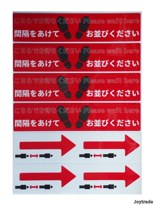 ◆商品 ソーシャルディスタンス シール ソーシャルディスタンス用フロア誘導シール【こちらでお待ちください-間隔をあけてお並びください×4 矢印×4】足型入り横型シール4枚と矢印4枚のセット ◆お店の床に貼る誘導案内シール フロア、レジ前等 お店の床に。 A3サイズ1枚分の台紙シートから、足型マーク入り横型案内シール4枚とソーシャルディスタンスマーク入り矢印4枚を切り出してセットにしました。 ◆説明 表面材質:硬度9Hガラスコーティング 中層:形状記憶PETフィルム 印刷面:塩化ビニール 接着剤:アクリル系樹脂接着剤 製造国:日本 ・表面に硬度9H相当のハードコーティングシートを貼っており、耐久性・耐熱性に優れ、輝きが持続します。 ・防滑加工済みだから、きれいさ長持ちながら滑りにくい。 ・剥がした後も安心!床を汚さない糊残りの少ない接着剤を使用。 ※凸凹のある床材や油分のある床面、ワックスの塗ってある床面には貼れません。平らな鏡面床材でシールが確実に付く床面に適しています。ワックスが塗ってある場合はワックス剥離剤で落としてから貼ってください。 ※細部のデザインや表記は予告なく変更することがあります。また、表記の正確性を保証するものではありません。 ※商品は製造ロット等により、A3サイズの台紙に貼り付ける場合と、個別の形状ごとに台紙ごとカットしたものをまとめて梱包する場合があります。 ◆よくあるご質問 ・シールは簡単に貼れますか? ・どなたでも簡単に貼ることができます。 ・シールの表面は滑りやすくないですか? ・表面に防滑加工をしておりますので滑り難くなっています。 ・表面に付いた汚れはどうやれば取れますか? ・硬く絞った雑巾で拭いてください。油汚れやヒール痕などはアルコールで拭いてください。 ・どんな床にも貼れますか? ・凸凹のある床材や油分のある床面、ワックスの塗ってある床面には貼れません。平らな鏡面床材でシールが確実に付く床面に適しています。 ・貼り直しはできますか? ・糊の粘着力が落ちますのでお勧めしません。 ・耐久性は? ・お客様の来店数にもよりますが、概ね1年程度となります。 <注意事項> ・硬いものでシール表面を叩いたり、擦ったりしないでください。 ・ポリッシャー(床磨き機)等でシール表面を清掃するのは避けてください。 ・表面のハードコーティングシートが割れますのでシールを折り曲げないでください。ソーシャルディスタンス シール ソーシャルディスタンス用フロア誘導シール【こちらでお待ちください-間隔をあけてお並びください×4 矢印×4】足型入り横型シール4枚と矢印4枚のセット