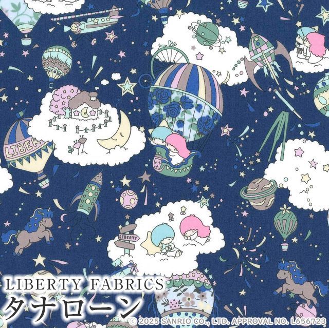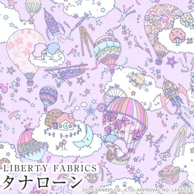 (C) 2025 Sanrio★2025年SSコレクション★●素材:綿100%●生地幅:約110cm【生地の特徴】望遠鏡を覗くとそこには幻想的な空飛ぶ車、熱気球、惑星、輝く星の世界が広がっています。2018年SSの子供服コレクション用にリバティのデザインスタジオにて描かれた「スカイ・ハイ」は、幼い子供の目を通じて見た不思議な世界や光景を称えたデザインです。今回の新しい作品では、この幻想的な世界をリトルツインスターズが探検し夢のような物語を紡いでいます。2025SS My Melody & Little Twin Stars 50th Anniversary Collectionリバティ・ファブリックスとリトルツインスターズのコラボレーションコレクションです。少し大人っぽい配色も加え、子供から大人まで楽しんでいただけるコレクションとなっています。上品な艶とやわらかな肌ざわりが特徴のリバティ・ファブリックスのタナローン。織の密度が高く、しなやかで豊かなドレープ性があります。ブラウスやワンピース、スカートなどの衣類の他、小物やインテリアなど幅広くお使いいただけます。※商用利用不可【ご注文前に必ずお読み下さい】・表示価格は10cmの価格です。・生地は30cmから10cm単位で販売しております。(30cmご希望の場合は、数量「3」と入力して下さい。 例:数量「10」=生地幅×長さ1m)・ご覧になるディスプレイ環境などにより、商品画像と実物の色味が異なる場合があります。・生産ロットにより、色味や風合いが変わる場合があります。幅につきましても若干差が生じる場合があります。予めご了承くださいませ。・当社の他オンラインショップと在庫を共有しており、注文が確定しても完売・欠品の場合があります。予めご了承下さい。・生地はカットしてご用意するため、注文キャンセル・数量変更・返品がお受けできません。【追跡可能メール便について】メール便は対応可能商品の【合計数量:20まで】承ります。※商品ページに〔メール便対応商品〕と表記のあるもののみ対応可能です。楽天市場のシステム上、メール便対応可能数量を越える場合でもメール便が選択できるようになっております。メール便対応数量を超えたご注文につきましては、ご注文受付及び商品手配を保留させていただきます。※宅配便をご希望の場合や、メール便対応可能数量を越える場合は、配送方法を【宅配便(佐川急便)】にご変更ください。※商品画像に掲載しております、メール便に関するご説明事項を必ずご確認ください。