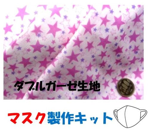 ★残りわずかです(廃番になりました) マスク製作キット ・2個分( 表の生地+裏生地(白のダブルガーゼ)+白のマスクゴム+作り方レシピ+実寸大型紙付き) スターズ( オフホワイト ピンク ) ダブルガーゼ ( 生地 マスク )( 星 空 )