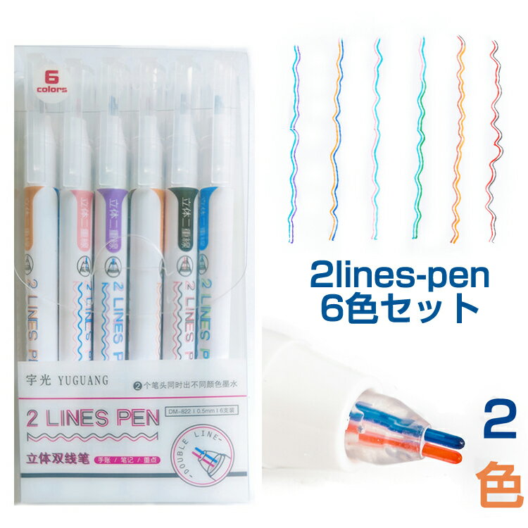 送料無料 \\2LINES PEN 6本セット 2色ペン 二重線 立体 ステレオ 水性 ミリペン カラーペン カラーペンセット イラストマーカー DIY メッセージカード プレゼント 塗り絵 デコ クリスマス 年賀状 サプライズボックス