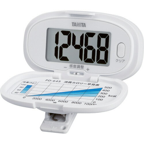 ●色はホワイトです。●文字高15mmの大型表示。●入門ユーザーやシルバー層でも使いやすい単機能。●感度調整機能付き。●電池蓋が外れにくく電池誤飲の危険が少ない仕様。●最大測定歩数/最小1歩〜99999歩●歩数精度/±3%(振動試験機による)●電池寿命/約2年(1日4時間使用の場合)●電源/DC3V(CR2032コイン形リチウム電池×1個)●寸法/W65×D28(クリップ部分を含む)×H37mm●重量/約30g(電池含む)●色/ホワイト●材質/ABS樹脂●付属品/取扱説明書、保証書、お試し用電池(CR2032)1個●保証期間/1年●メーカー/タニタ●型番/PD645WH●JANコード/4904785564510※メーカー都合によりパッケージ・仕様等が予告なく変更される場合がございます。ご了承ください。本商品は自社サイトでも販売しているため、ご注文のタイミングにより、発送までにお時間をいただいたり、やむをえずキャンセルさせていただく場合がございます。※沖縄へのお届けは別途1650円(税込)の送料がかかります。