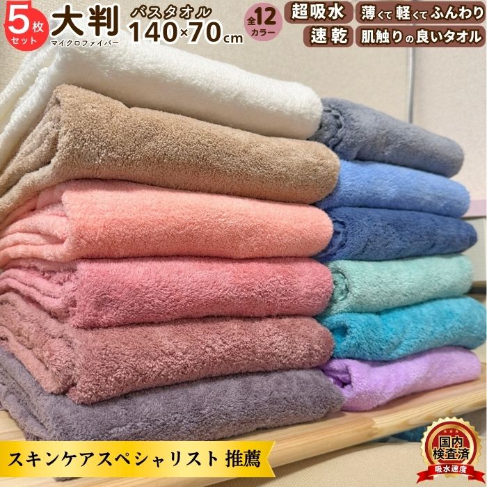 バスタオル 大判 薄手 速乾 140×70cm 5枚 セット マイクロファイバー 大きめ 吸水 髪 ふわふわ 洗面所 プール スポーツ 無地 ペット 犬 超吸水 水泳 テニス ハンカチ まとめ買い たおる ドライ ヘア 髪の毛 キッチン 送料無料 ギフト プレゼント レビュープレゼント