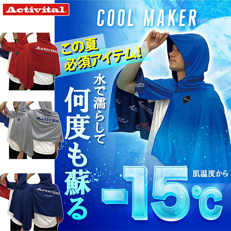 縦65×横145cm アクティバイタル メンズ レディース クールメイカー 冷却タオルポンチョ SP アクセサリー クールポンチョ 熱中症対策 紫外線カット グレー ネイビー ブルー レッド 青 赤 灰色 Activital CRI1000